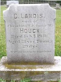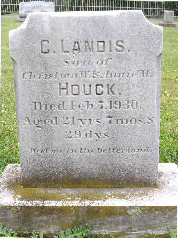 Christian Landis Houck was born on 9 June 1908 at Leaman Place (Paradise), Lancaster, Pennsylvania.1 He died on 7 February 1930 at Leaman Place (Paradise), Lancaster, Pennsylvania, at age 21.1 He was buried on 10 February 1930 at Hershey Mennonite Cemetery, New Milltown (Paradise), Lancaster, Pennsylvania.1 Christian Landis Houck Find-a-Grave.com ID # 112395353 + obit + family links.