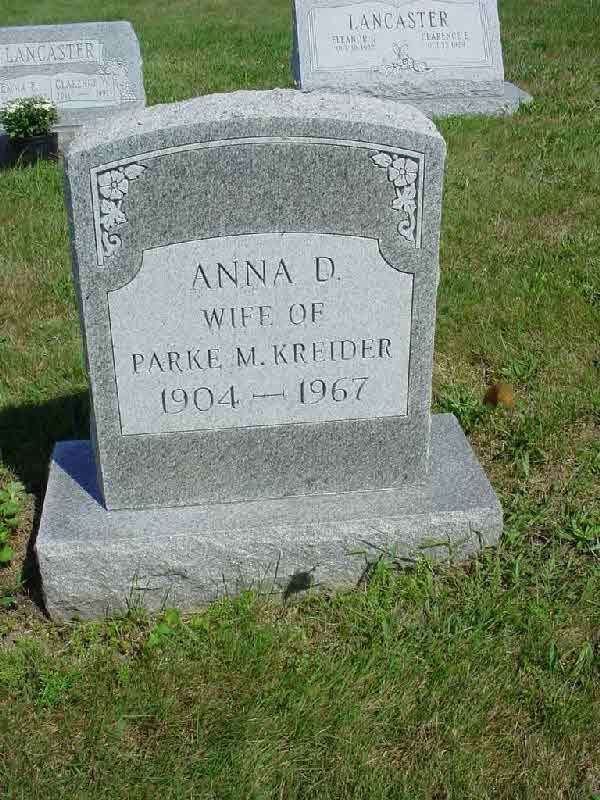Anna Zink was born on 24 April 1904 at Lancaster, Pennsylvania.2 She married Park Mellinger Kreider, son of Benjamin Mellinger Kreider and Susan Eva Kreider, after 1914.1 Anna Kreider died on 1 May 1967 at Lancaster General Hospital, Lancaster, Lancaster, Pennsylvania, at age 63.2 She was buried on 4 May 1967 at Goods Mennonite Church Cemetery, Elizabethtown, Lancaster, Pennsylvania; Kreider, Anna D., daughter of Benjamin F. and Lillie (Dupler) Zink, was born in Lancaster Co., Pa., Apr. 24, 1904; died at Lancaster General Hospital, May 1, 1967; aged 63 y. 8 d. She was married to Parke M. Kreider, who survives. Also surviving are 2 brothers (Raymond D. and Paul D.) and 2 sisters (Virgie--Mrs. Frank Belisle and Emma--Mrs. Elmer P. Weaver, Sr.) She was a member of the Mt. Joy Church. Funeral services were held at the Nissley Funeral Home, Mt. Joy, May 3, with Henry Frank officiating; interment in Good's Cemetery.2