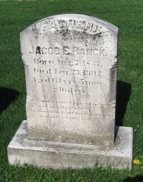 Jacob Eby Ranck was born on 7 August 1837.1 He married Anna Buckwalter Kreider, daughter of Jacob Kreider and Anna Buckwalter, before 1864.1 Jacob Eby Ranck died on 23 January 1902 at age 64.1 He was buried on 26 January 1902 at Strasburg Mennonite Cemetery, Strasburg, Lancaster, Pennsylvania.2 Jacob Eby Ranck Find-a-Grave.com ID # 144008364.