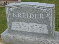 Paul D Kreider was born on 5 April 1908.1 He married Mary Groff before 1932.1 Paul D Kreider died on 10 June 1998 at age 90.2 He was buried on 13 June 1998 at Paradise Mennonite Cemetery, Paradise, Lancaster, Pennsylvania.2 Paul D Kreider Find-a-Grave.com ID # 54755264.