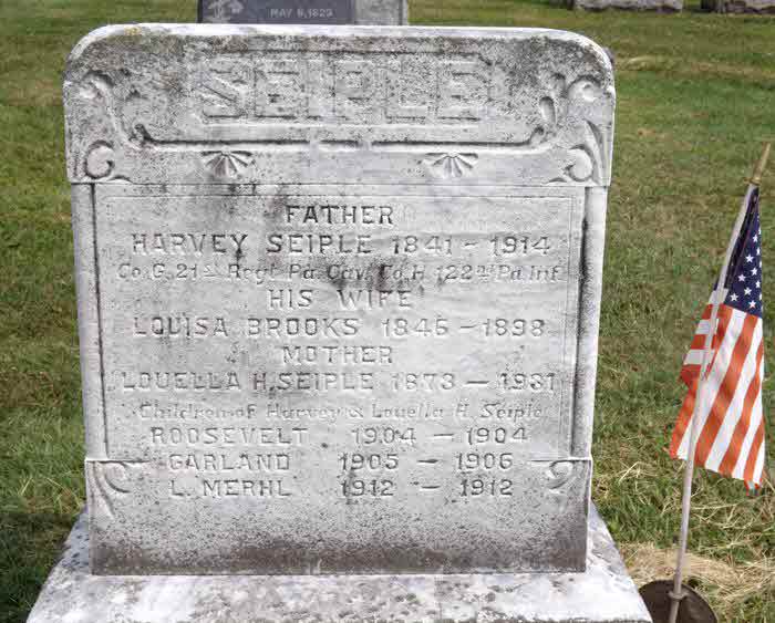? Peter Harvey Seiple was also known as Harvey Seiple.6 He appeared on the census of 10 September 1850 at Bart Township, Lancaster, Pennsylvania.1 He appeared on the census of 29 June 1860 at Chesnut Level- Drumore Township, Lancaster, Pennsylvania.7 He lived in 1888 at Lancaster, Pennsylvania.8 He witnessed Harvey Seiple was reared in Lancaster County, and received a common school education. When the Civil War broke out he enlisted in the 122nd Pennsylvania Volunteers I Co H and was in the Army of the Potomac under Gen. McClellan. In May 1863, he re-enlisted in Co G 21st PA Cav. for 6 months. At the expiration of his second enlistment, he re-enlisted in the same regiment until the close of the war. After the war he returned home and was married in 1869 to Louisa E Brooks, of Lancaster, daughter of Benjamin and Jane Barnett Brooks. Louisa was reared in Drumore township and for several years before she was married, she taught school. Three children were born to this union, all of whom died in infancy. Alice L Seiple, a neice was raised by Harvey and Louisa. After his marriage Mr Seiple entered the oil fields of Venango County and was engaged in the oil buisness for 18 years. He met with an accident while there, caused by a mill explosion, which for a time seriously injured him. In 1888 he returned to Lancaster County and for a time engaged in the restaurant business. About six years later he undertook a livery business, which he managed succesfully. In 1898 his wife died in Quarryville borough. On Oct 9 1901 he married Miss Louella Holmes, daughter of Dr. J. E. Holmes of Virginia. They now reside in Quarryville. in 1903.8 He was a man with his 'own income' on 4 May 1910 at Quarryville, Lancaster, Pennsylvania.9 He and Louella H Seiple appeared on the census of 4 May 1910 at Quarryville, Lancaster, Pennsylvania. At time of this census, Louella was recorded as being the mother of 4 children, only 2 living. Census also states that Harvey had been married twice, Louella only once. She is 32 years younger than Harvey.9 FamilySearch Family Tree ID # KN15-WDF.