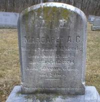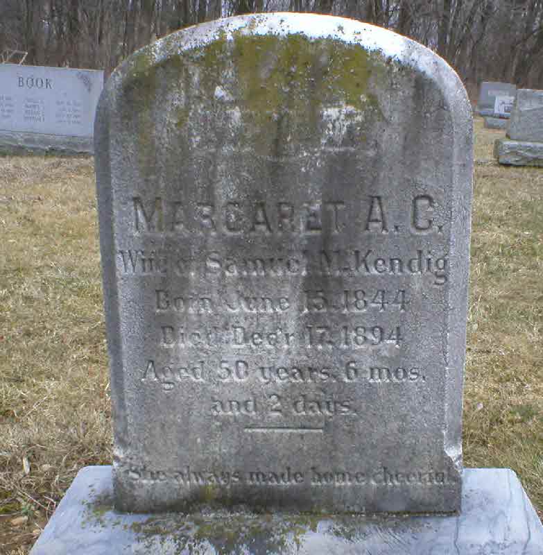 Margaret Miller was born on 15 June 1844 at Lancaster, Pennsylvania.1,2,3 She married Samuel B Kendig, son of John C Kendig and Elizabeth String.1 Margaret Kendig died on 17 December 1894 at Lancaster, Pennsylvania, at age 50. Name on tombstone is Margaret A. C. wife of Samuel M Kendig.3 She was buried on 20 December 1894 at New Providence Mennonite Cemetery, New Providence, Lancaster, Pennsylvania.3 Margaret Miller Find-a-Grave.com ID # 106009086.