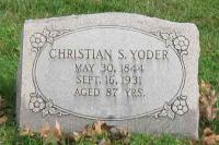 Christian S Yoder was born on 24 May 1844 at Pennsylvania. Tombstone reads birth as May 30 1844.1,2,3,4 He married Rebecca Johnson.5 Christian S Yoder married Mary Elizabeth Findley, daughter of Samuel Findley and Sarah Good, circa 1878 at Lancaster, Pennsylvania.6 Christian S Yoder died on 15 September 1931 at Warwick Township, Lancaster, Pennsylvania, at age 87. Death date recorded in PA & Nj differs from date on death certif by 10 years. Cause of death was general arteriosclerosis.3,7 He was buried on 17 September 1931 at Mellingers Cemetery, Lancaster, Lancaster, Pennsylvania.7 Christian S Yoder Find-a-Grave.com ID # 79889397.