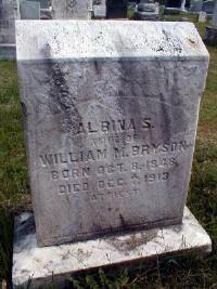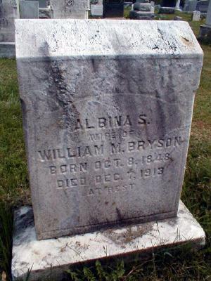 Albina S Jordon was born on 8 October 1848 at Chester, Pennsylvania.2,3 She married William Miers Bryson, son of Joseph Bryson and Susannah Malinda Gregg, on 26 December 1865 at Holy Trinity Evangelical Luthern Church, Lancaster, Pennsylvania; Last pension payment was 4 Nov 1913 for husband military service; Was married by Samuel Laird according to pension records. Date also recorded as 26 Dec 1863.4 Albina S Jordon died on 7 December 1913 at Parkesburg, Chester, Pennsylvania, at age 65. Cause of death was pneumonia with contributory heart disease.3 She was buried on 10 December 1913 at Upper Octorara Presbyterian Cemetery, Parkesburg, Chester, Pennsylvania.2 Albina S Jordon Find-a-Grave.com ID # 34666890.5