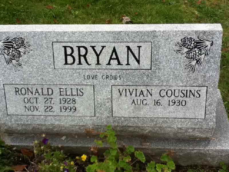 Ronald Ellis Bryan was born on 27 October 1928 at Armstrong, Pennsylvania.1 He married Vivian Cousins, daughter of John White Cousins and Vera Hill, on 28 July 1950 at Armstrong, Pennsylvania.1 Ronald Ellis Bryan died on 22 November 1999 at Kittanning, Armstrong, Pennsylvania, at age 71.1 He was buried on 25 November 1999 at Mateer Cemetery, Armstrong, Pennsylvania.1 Ronald Ellis Bryan Find-a-Grave.com ID # 45205344.