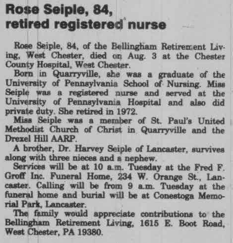 Rose Seiple was born in 1908 at Pennsylvania.1 She died on 3 August 1991 at West Chester, Chester, Pennsylvania.2 She was buried on 6 August 1991 at Conestoga Memorial Park, Lancaster, Lancaster County, Pennsylvania.2 Rose Seiple Find-a-Grave.com ID # 236285846.