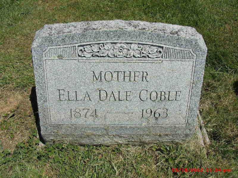 Ella May Dale married Ulysses Simpson Grant Coble.2 Ella May Dale was born on 16 November 1864 at Houserville, Centre, Pennsylvania.1,2 She died on 3 April 1963 at Centre, Pennsylvania, at age 98.2 She was buried on 6 April 1963 at Houserville Cemetery, Houserville, Centre, Pennsylvania.2 Ella May Dale Find-a-Grave.com ID # 21121226.
