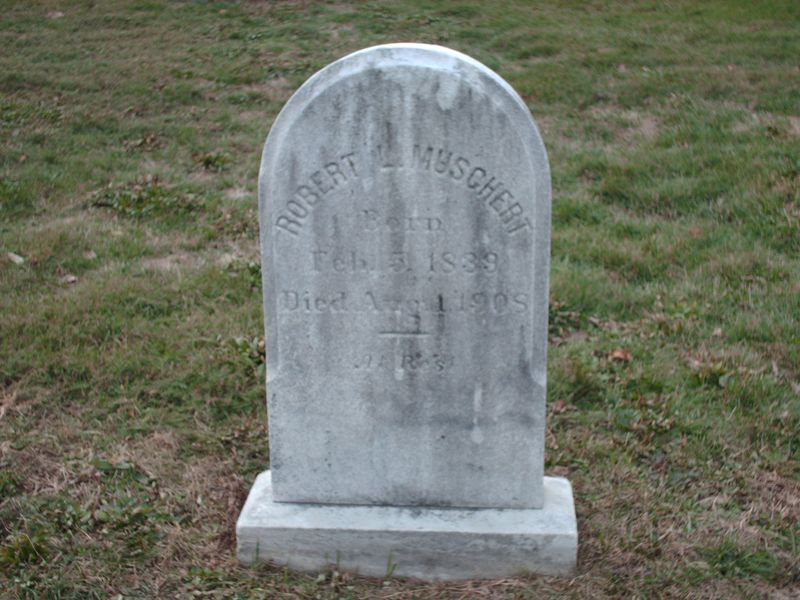 Robert L Muschert was born on 5 February 1839 at Philadelphia, Pennsylvania.1,2 He married Jane (?)3 Robert L Muschert died on 1 August 1908 at age 69.2 He was buried on 4 August 1908 at Morrisville Cemetery, Morrisville, Bucks, Pennsylvania.2 Robert L Muschert Find-a-Grave.com ID # 67686394.