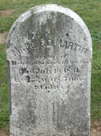 Margaret C Martin was born on 23 November 1867 at Lancaster, Pennsylvania. Date calulated from tombstone.1 She died on 10 July 1890 at Lancaster, Pennsylvania, at age 22.2 She was buried on 13 July 1890 at Pequea Presbyterian Cemetery, Gap, Lancaster, Pennsylvania. Inscription reads age 22y, 7m, 17 d.2 Margaret C Martin Find-a-Grave.com ID # 40062913 + family links.