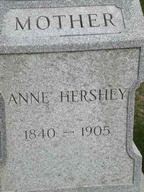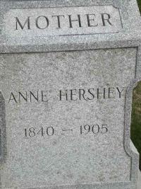 Ann Kreider was born on 26 October 1840.1 She married Elias Hershey, son of Jacob Hershey and Elizabeth Eby, on 28 November 1865.1 Ann Kreider died on 27 June 1905 at age 64.1 She was buried on 30 June 1905 at Paradise Mennonite Cemetery, Paradise, Lancaster, Pennsylvania. "HERSHEY.-Anne Kreider, wife of Elias Hershey, died at her home near Paradise, Pa., June 27, 1905, aged 64 Y., 8 M., 1 D. She will be sadly missed in the home by the husband and daughter who remain, besides two sons and two daughters married. She was a strong woman for her years, able and willing to lend a helping hand at any work her hands found to do, until disease took hold of her; then all that human hands could do was of no avail and for ten long weeks she suffered till God saw fit to relieve her and take her to himself. We can think of something sadder, and that is for one to die and not be missed. Funeral services held June 29th by D.R. Workman at the house, and Bish. Isaac Eby and John Senger at the Paradise Mennonite church, where the deceased was a member."