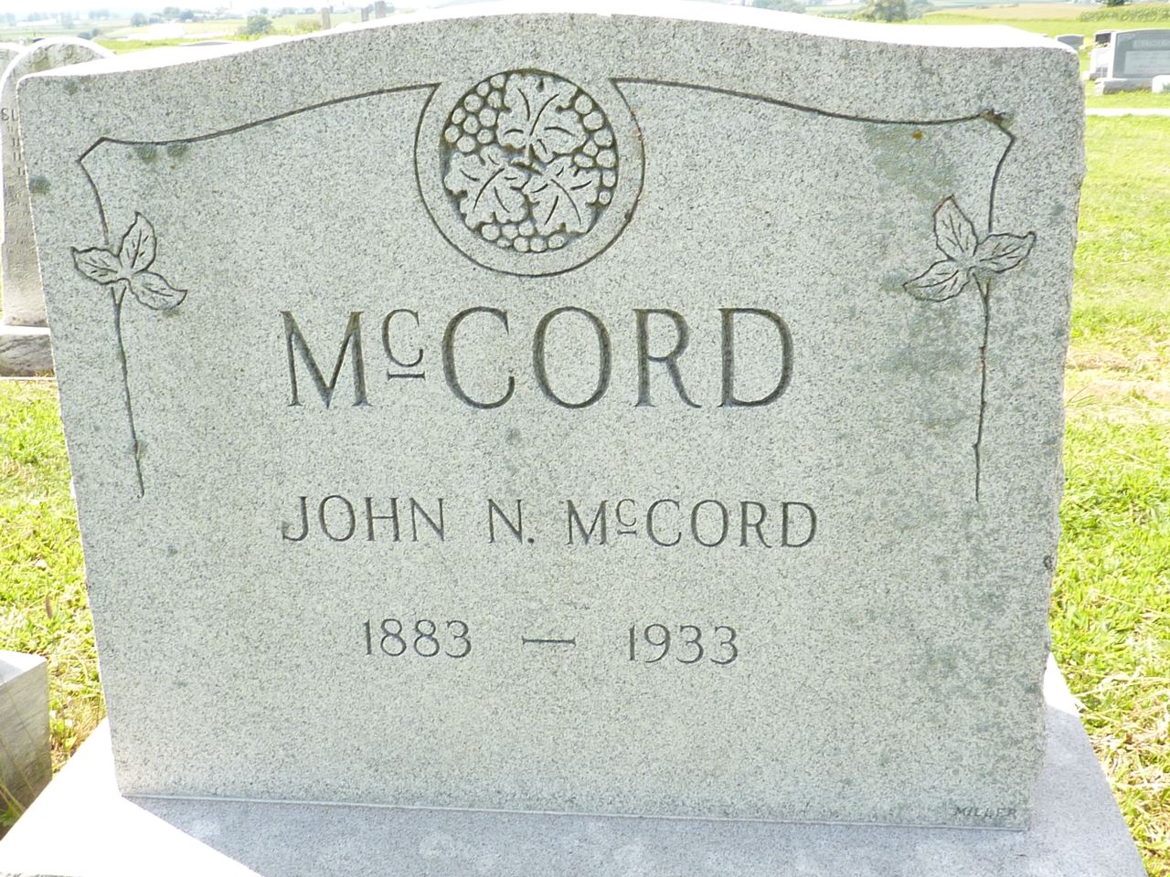 John Newton McCord was born on 31 July 1882 at Salisbury Heights, Lancaster, Pennsylvania.1,2 He died on 11 April 1933 at Salisbury Heights, Lancaster, Pennsylvania, at age 50.2 He was buried on 15 April 1933 at Georgetown Cemetery, Georgetown, Lancaster, Pennsylvania.2 John Newton McCord Find-a-Grave.com ID # 84313478.