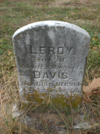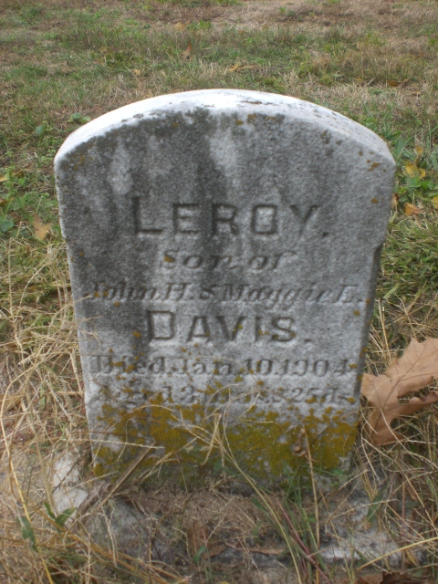 Leroy Davis was born on 16 September 1903.1 He died on 10 January 1904.1 He was buried on 13 January 1904 at Pequea Baptist Cemetery, Gap, Lancaster, Pennsylvania.1 Leroy Davis Find-a-Grave.com ID # 68268153.