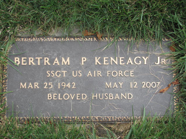 Bertram Parke Keneagy, Jr. 65, of Reynoldsburg, Saturday, May 12, 2007 at home. Veteran of US Air Force; retired from Byers Imports. Preceded in death by father Bertram Parke Keneagy, Sr. Survived by wife Sharon Keneagy; sons Kevin James Keneagy and Brent Michael Keneagy (Marcie Radell); mother Esther Keneagy; constant companion Maxwell; brothers Ethan and Laine Keneagy; sisters Beulah Sheaffer, Fernande Buzzard, Denise King, Karen Eby, and Anita Wiggins; sister-in-law Carolyn Fenneman; many nieces and nephews. Family will receive friends Tuesday 6 – 8 p.m. at Cotner Funeral Home, 7369 E. Main St., Reynoldsburg. Private burial at Glen Rest Memorial Estate. In lieu of flowers, contributions may be made to American Society for the Prevention of Cruelty to Animals (ASPCA) 424 E. 92nd St New York, NY 10128-6804 or online at www.aspcs.org. Messages may be sent to the family at www.cotnerfuneralhome.1,2 He was buried on 17 May 2007 at Glen Rest Memorial Estate, Reynoldsburg, Ohio.1 His funeral was held at Cotner Funeral Home, 7369 E. Main St., Reynoldsburg, Ohio, on 17 May 2007 Contributions may be made to ASPCA, 424 E. 92nd St, NY, NY. 10128-6804 or online at www.aspcs.org. Messages may be sent to family at www.cotnerfuneralhome.com.3 Bertram Park Keneagy Jr. Find-a-Grave.com ID # 132521648.