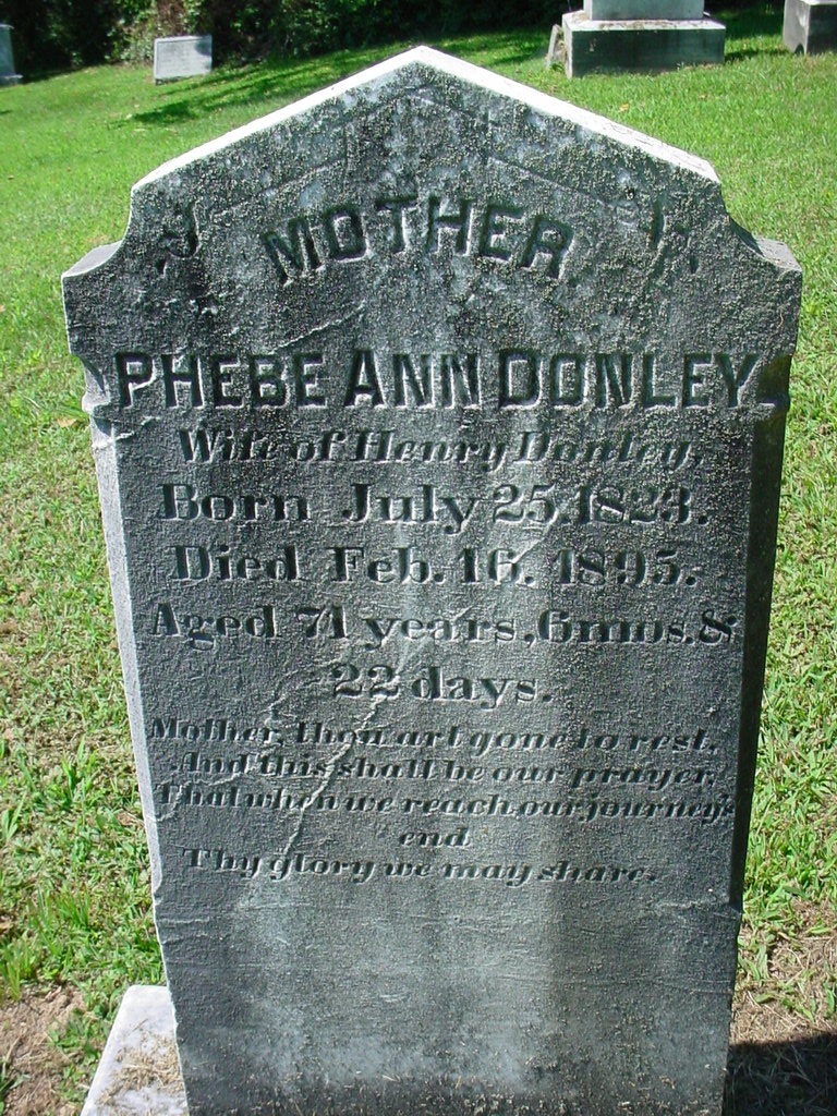 Phebe Ann Wright was born on 25 July 1823 at Pennsylvania.1 She married Henry Donley before 1845.2 Phebe Ann Wright died on 16 February 1895 at age 71.1 She was buried on 19 February 1895 at Octorara United Presbyterian Cemetery, Quarryville, Lancaster, Pennsylvania.1 Phebe Ann Donley Find-a-Grave.com ID # 90897632.