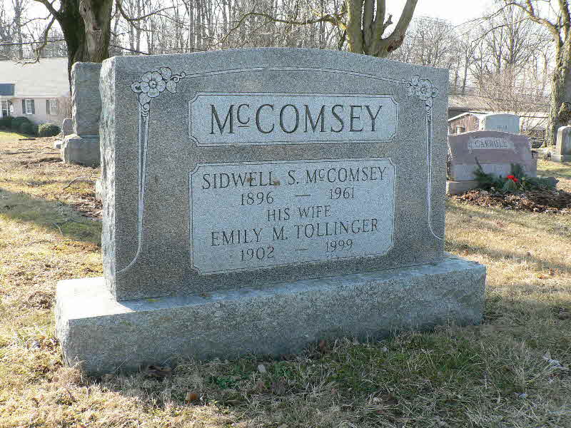 Sidwell Samuel McComsey was born on 14 December 1896 at Lancaster, Pennsylvania.1 He married Emily Tollinger.2 Sidwell Samuel McComsey died on 18 February 1961 at Lancaster General Hospital, Lancaster, Lancaster, Pennsylvania, at age 64. Cause of death was cancer of the bladder, 2 year duration.1 He was buried on 21 February 1961 at Quarryville Cemetery, Quarryville, Lancaster, Pennsylvania. Death certif states burial was at Mt Zion Meth Cemetery, but stone is at Quarryville Cemetery.3