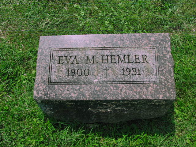 Eva M Lawrence was born in 1900.1 She married Jospeh P Hemler circa 1923.1 Eva M Hemler died on 30 December 1931 at Hanover, Adams, Pennsylvania. Death due to complications of diseases.1,2 She was buried on 31 December 1931 at St Josephs Catholic Cemetery, Hanover, York, Pennsylvania.1,2 Eva M Lawrence Find-a-Grave.com ID # 133626908.