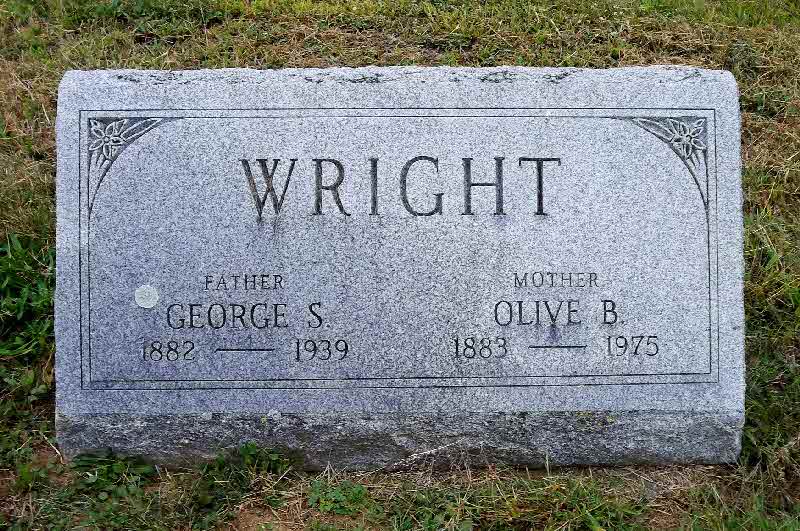 George S Wright married Olive B (?)2 George S Wright was born on 23 July 1882 at Pennsylvania.1 He died on 23 November 1939 at 1 mile south, Parkesburg, Chester, Pennsylvania, at age 57. Cause of death was Angina Pectoria, sudden attack while driving automobile. Was presumed dead when car left the road and crashed into tree. No fatal marks on body.1 He was buried on 28 November 1939 at Upper Octoraro Cemetery, Parkesburg, Chester, Pennsylvania.1 George S Wright Find-a-Grave.com ID # 86052907.