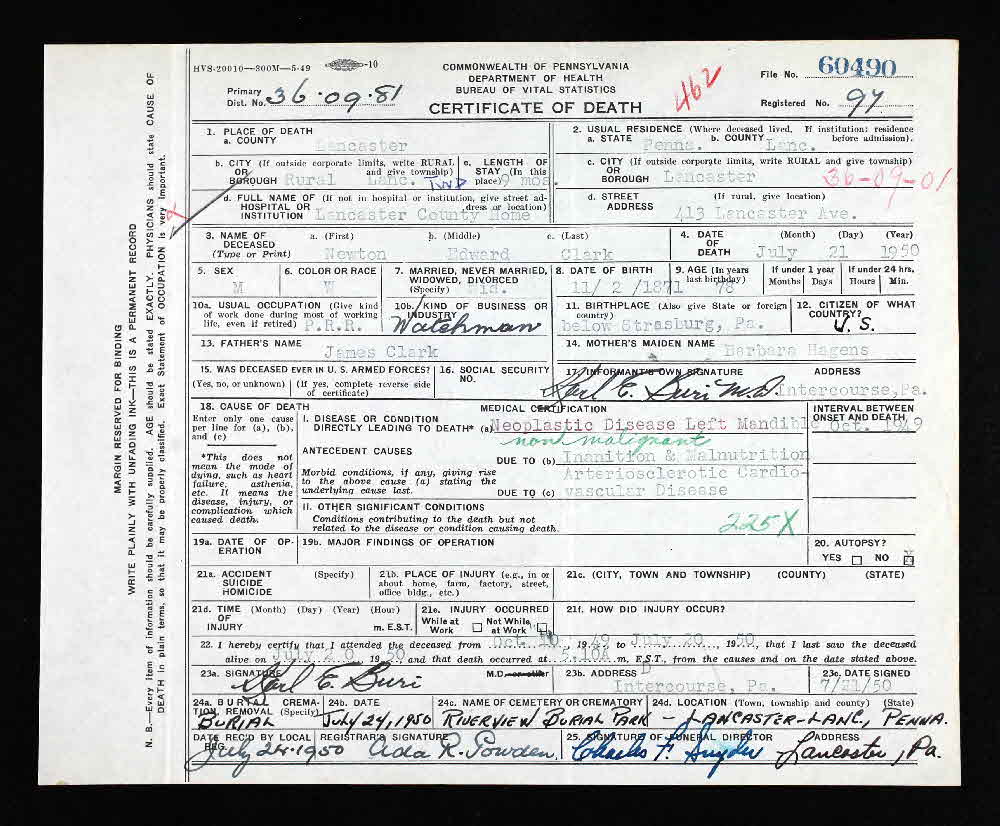 Newton Edward Clark was born on 2 November 1871 at South of, Strasburg, Lancaster, Pennsylvania.2,3 He married Florence Grace Lowery, daughter of James Nelson Lowery and Susan Suslome? Bryson, on 7 January 1897 at Lancaster, Lancaster, Pennsylvania. Newton Edward Clark died on 21 July 1950 at Lancaster County Hospital, Lancaster, Lancaster, Pennsylvania, at age 78. Cause of death was Neoplastic disease left mandible, non malignant, Inanition & Malnutrition, Arteriosclerotic Cardiovascular Disease since Oct 1949.2,3 He was buried on 24 July 1950 at Riverview Burial Park, Lancaster, Lancaster, Pennsylvania.3 Newton Edward Clark Find-a-Grave.com ID # an unknown place ; 70497776.2