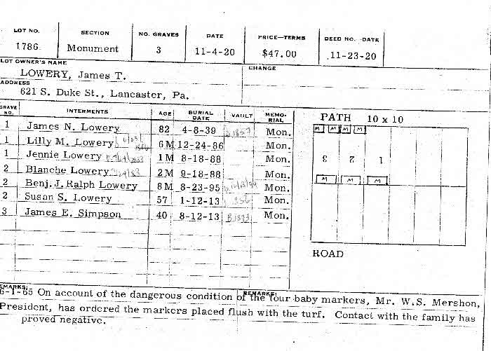 - [S126] Find-a-Grave.com Obituary, Various, Find a Grave, database and images (https://www.findagrave.com/memorial/109689395/… accessed 15 February 2022), memorial page for Sarah E Harman Lowery (24 Dec 1852–30 May 1919), Find a Grave Memorial ID 109689395, citing Greenwood Cemetery, Lancaster, Lancaster County, Pennsylvania, USA; Maintained by Yvonne Freed Dunn (contributor 47421401).