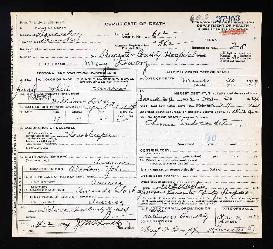 Mary Yohn was born on 28 April 1877 at Pennsylvania.1 She married William N (Nelson?) Lowery, son of James Nelson Lowery and Susan Suslome? Bryson. Mary Lowery died on 30 March 1924 at Lancaster County, Pennsylvania, at age 46.1 She was buried on 3 April 1924 at Mellinger Mennonite Cemetery, Lancaster, Lancaster County, Pennsylvania.1 Mary Yohn Find-a-Grave.com ID # 80134420.