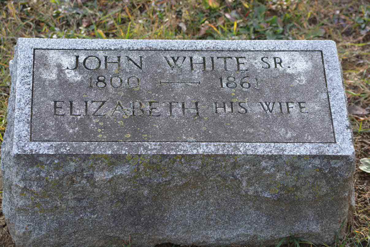 John White was born in 1800 at Pennsylvania.1 He married Elizabeth (?) before 1827 at Chester, Pennsylvania.1 John White was buried in 1861 at Honey Brook United Methodist Church Cemetery, Honey Brook, Chester, Pennsylvania.2 He died on 11 April 1861 at Pennsylvania.3,4 John White Find-a-Grave.com ID # 28993617.