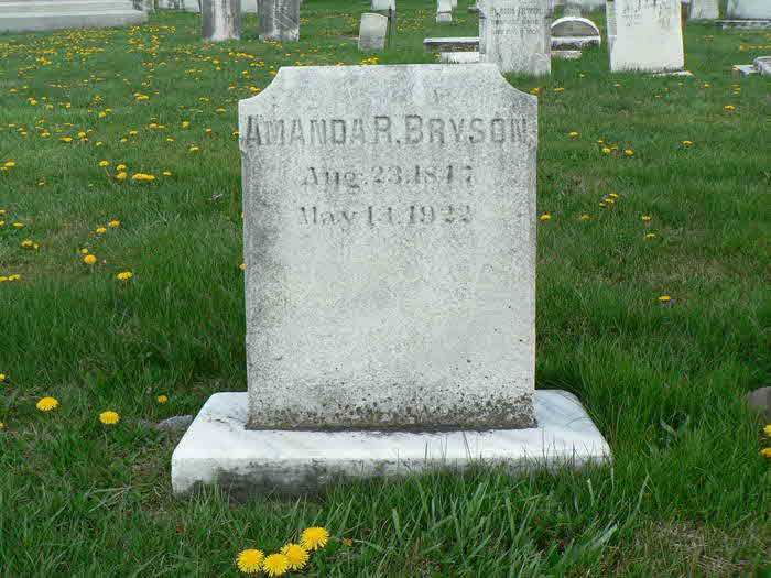Amanda Bryson was born on 23 August 1847 at Lancaster, Pennsylvania.1 She died on 13 May 1922 at Paradise, Lancaster, Pennsylvania, at age 74. Cause of death was chronic heart problems.1 She was buried on 15 May 1922 at Trinty Lutheran Cemetery, New Holland, Lancaster, Pennsylvania.1 Amanda Bryson Find-a-Grave.com ID # 26234594.