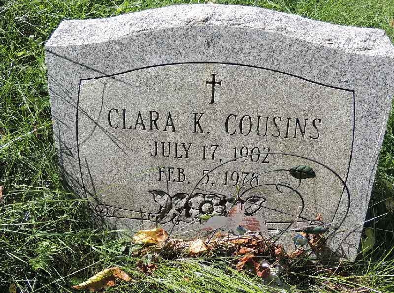 Clara Katherine Bowser was born on 17 July 1902.1 She married Jesse Mace Cousins, son of Charles Austin Cousins and Carrie Larke, before 1937.1 Clara Katherine Bowser died on 2 February 1978 at Kittanning, Armstrong, Pennsylvania, at age 75.1 She was buried on 5 February 1978 at Appleby Manor Presbyterian Church Cemetery, Ford City, Armstrong, Pennsylvania.1 Clara Katherine Bowser Find-a-Grave.com ID # 38910742 + family links.
