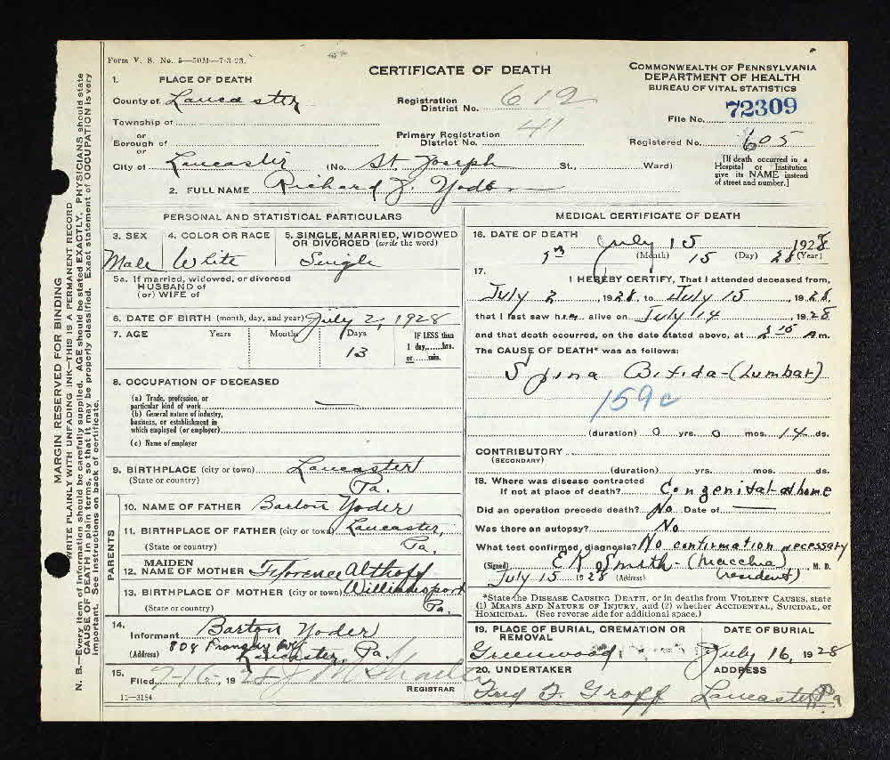 Richard J Yoder was born on 2 July 1928 at Lancaster, Lancaster, Pennsylvania.1 He died on 15 July 1928 at St Joseph Hospital, Lancaster, Lancaster, Pennsylvania.1 He was buried on 16 July 1928 at Greenwood Cemetery, Lancaster, Lancaster, Pennsylvania.1