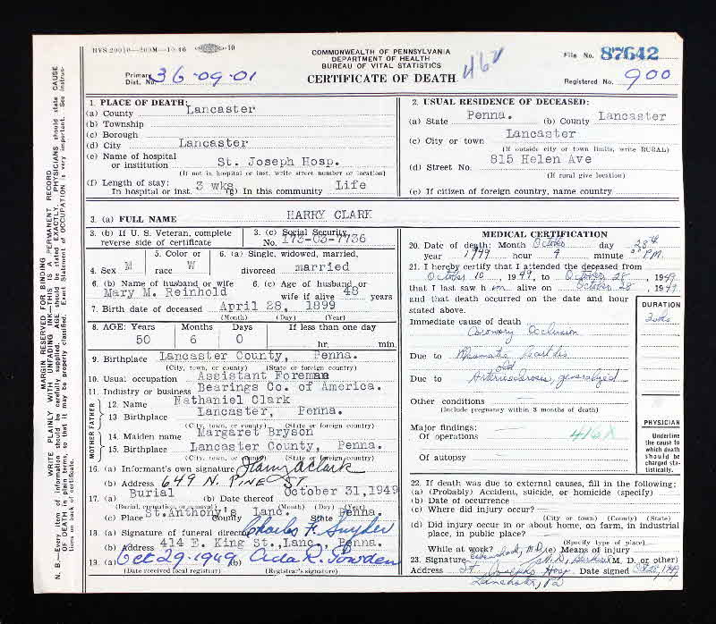 Harry Clark was born on 28 April 1899 at Lancaster County, Pennsylvania.1,2 He married Mary M Reinhold. Harry Clark died on 28 October 1949 at St Joseph's Hospital, Lancaster, Lancaster County, Pennsylvania, at age 50. Cause of death was coronary occlussion.2 He was buried on 31 October 1949 at Saint Anthonys Roman Catholic Cemetery, Lancaster, Lancaster County, Pennsylvania.3 Harry Clark Find-a-Grave.com ID # 21417731.