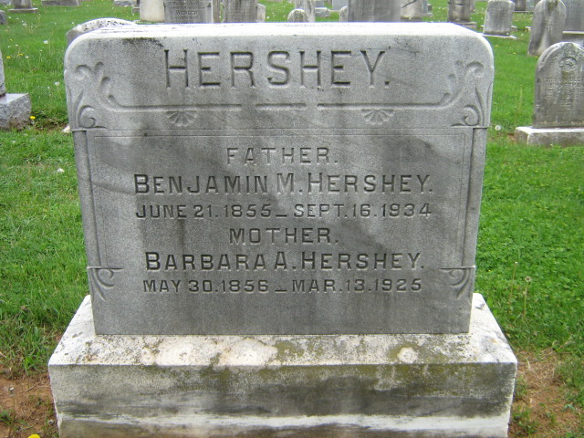 Benjamin Hershey was born on 21 July 1853 at Paradise Township, Lancaster, Pennsylvania.1,2 He married Barbara A Kreider circa 1893.2 Benjamin Hershey died on 16 September 1934 at Lancaster General Hospital, Lancaster, Lancaster, Pennsylvania, at age 81. Cause of death was Cataract Extraction. Contributing was hypostatic pneumonia.2 He was buried on 20 September 1934 at Hershey Mennonite Cemetery, New Milltown, Lancaster, Pennsylvania.2 Benjamin Hershey Find-a-Grave.com ID # 148489530.