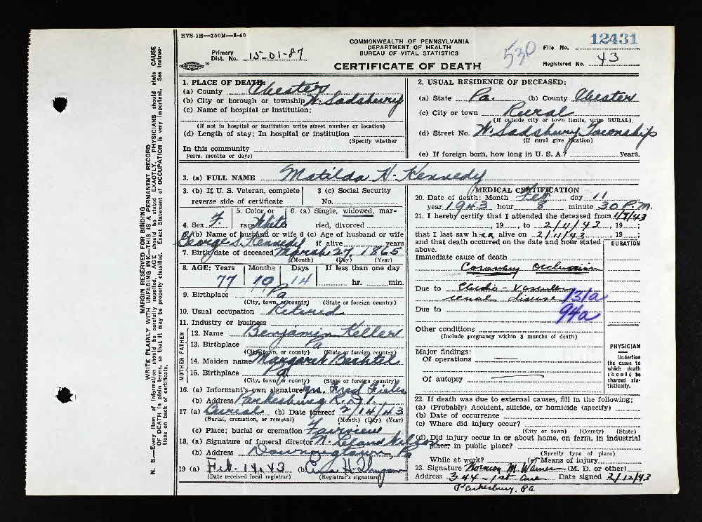 Matilda Keller married George Kennedy.2 Matilda Keller was born on 27 March 1865 at Pennsylvania.1,2 She died on 11 February 1943 at W Sadsbury, Chester, Pennsylvania, at age 77. Cause of death was coronary occlusion.2 She was buried on 14 February 1943 at Fairview Cemetery, South Coatesville, Chester, Pennsylvania.2
