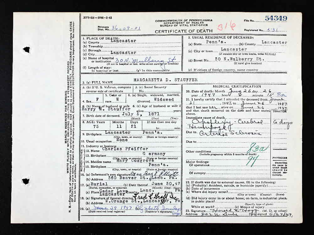 - [S32] Death Certificate, Pennsylvania, Death Cerificates, 1906-1964 for Margaretta D Stauffer # 54349.