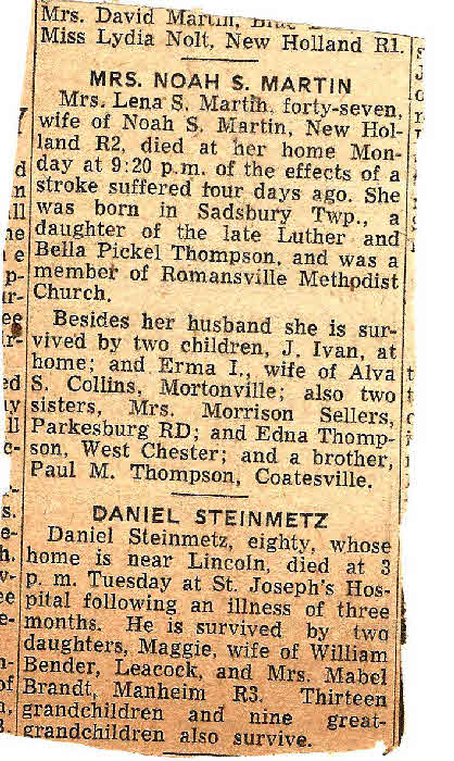 Lena Sara Thompson married Noah Sylvester Martin, son of Jacob Gabel Martin and Sarah Feister.1 Lena Sara Thompson was born on 14 October 1901 at Sadsbury Township, Lancaster, Pennsylvania.1 She died on 1 November 1948 at at home, New Holland, Lancaster, Pennsylvania, at age 47.1