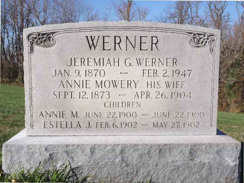 Jeremiah Grant Werner was born on 9 January 1870.1 He married Annie Mowery before 1894.1 Jeremiah Grant Werner died on 2 February 1947 at age 77.1 He was buried on 5 February 1947 at Boehms Chapel Cemetery, Willow Street, Lancaster, Pennsylvania.1 Jeremiah Grant Werner Find-a-Grave.com ID # 34328805.