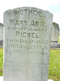 Mary Ann Brown was born on 20 December 1845 at Little Britain Township, Lancaster, Pennsylvania.1 She married Ephraim C Pickel before 1869.1 Mary Ann Brown died on 19 August 1928 at Paradise, Lancaster, Pennsylvania, at age 82.1 She was buried on 21 August 1928 at Georgetown Methodist Cemetery, Georgetown, Lancaster, Pennsylvania.1 Mary Ann Brown Find-a-Grave.com ID # 44467716.