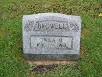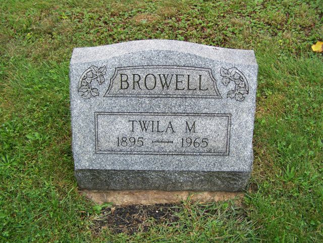 Twila Marie Hawk was born on 2 November 1895 at Widnoon, Armstrong, Pennsylvania.1 She married Robert N Browell before 1925.1 Twila Marie Browell died on 30 August 1965 at Kittanning, Armstrong, Pennsylvania, at age 69.1 She was buried on 2 September 1965 at Widnoon Methodist Cemetery, Widnoon, Armstrong, Pennsylvania.1 Twila Marie Browell Find-a-Grave.com ID # 41950150.