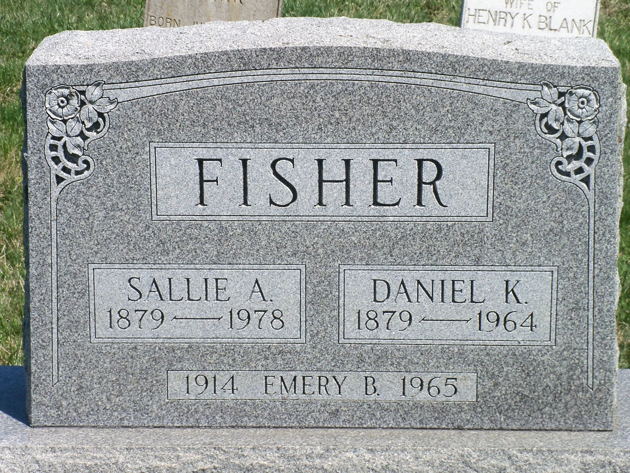Daniel K Fisher was born in 1879 at Weaverland, Earl Township, Lancaster, Pennsylvania.3 He married Sallie A Blank on 20 November 1910.1 Daniel K Fisher died on 6 October 1964 at East Earl, Lancaster, Pennsylvania.3 He was buried on 9 October 1964 at Millwood Mennonite Cemetery, Gap, Lancaster, Pennsylvania; Daniel Fisher, 85, dies at East Earl