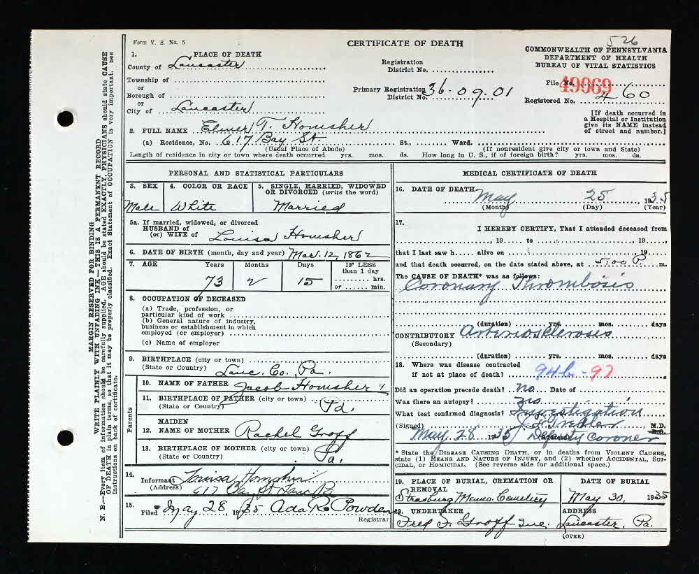 - [S32] Death Certificate, Pennsylvania, Death Certificates 1906-1966 for John Homsher, # 88097.