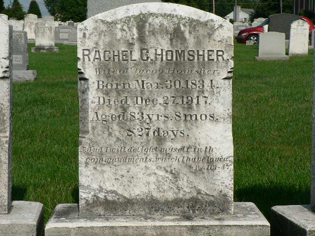 ? As of 24 March 1853,her married name was Homsher.1 She and Jacob Homsher appeared on the census of 11 June 1880 at 178 West Main St, Strasburg, Lancaster, Pennsylvania.5 Rachel Homsher was listed as a resident in John Galen Homsher and Harriet Viola Homsher's household in the census report in 1910 at West Main St, Strasburg, Lancaster, Pennsylvania; Also in household was sister in law to John, Josie Eager, age 29 and single.6
