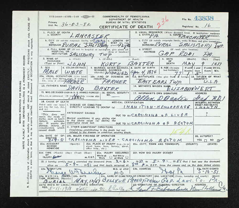 - [S32] Death Certificate, Pennsylvania, Death Certificates, 1906-1966 for John Kurtz Baxter # 43838.
