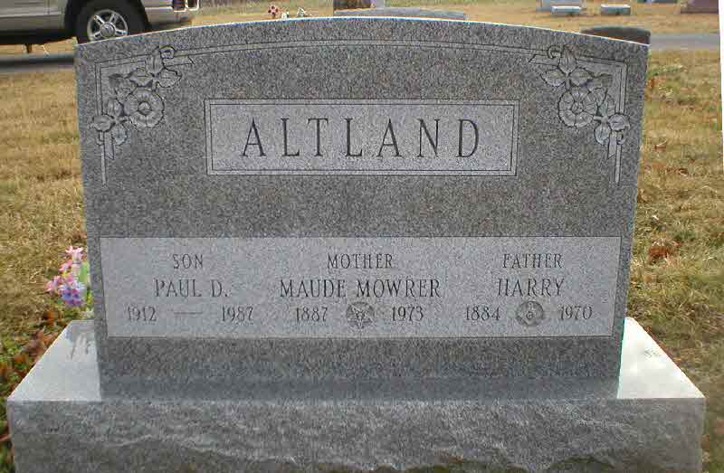 Harry Altland (?) was born on 20 May 1898 at Pennsylvania.1 He married Maude Mowrer, daughter of Elam M Mowrer and Letitia Reese, circa 1912.1 Harry Altland (?) died in May 1970 at Lancaster, Pennsylvania.1 He was buried in May 1970 at New Providence Mennonite Cemetery, New Providence, Lancaster, Pennsylvania.1 Harry Altland (?) Find-a-Grave.com ID # 105103489.
