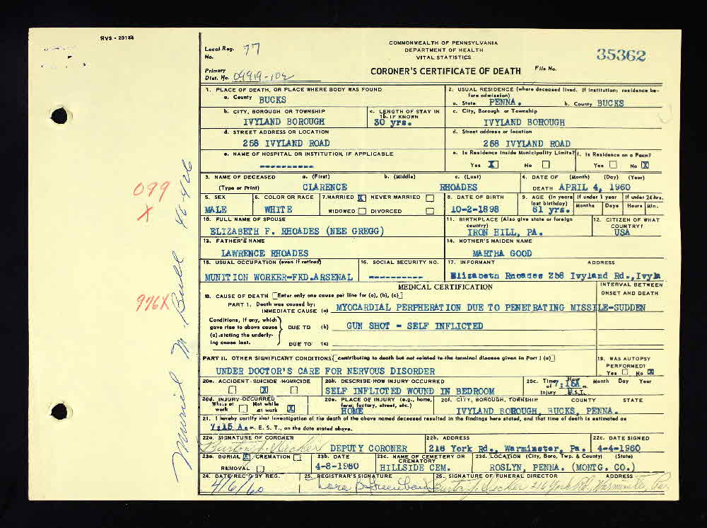 Clarence Rhoades was born on 2 October 1898 at Iron Hill, Pennsylvania.1 He married Elizabeth Frances Gregg, daughter of Theodore H Gregg and Elizabeth Miller, after 1920.1 Clarence Rhoades died on 4 April 1960 at from self inflicted gun shot in bedroom @ 7:15am, Ivyland, Bucks, Pennsylvania, at age 61.1 He was buried on 8 April 1960 at Hillside Cem, Roslyn, Montgomery, Pennsylvania.1