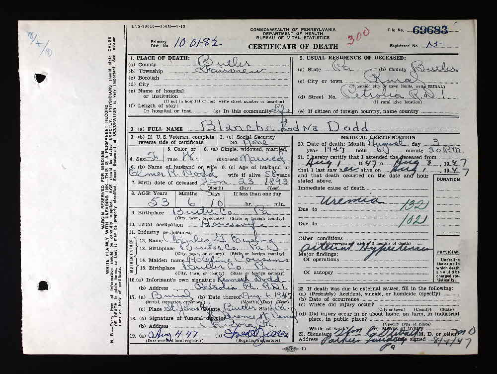 Edna Blanche Ewing was born on 23 January 1893 at Butler, Pennsylvania.1,2 She married Elmer Raymond Dodd before 1912.2 Edna Blanche Ewing died on 3 August 1947 at Fairview, Butler, Pennsylvania, at age 54.2 She was buried on 6 August 1947 at Saint Johns Reformed Church Cemetery, Chicora, Butler, Pennsylvania.2 Edna Blanche Ewing Find-a-Grave.com ID # 162019510.
