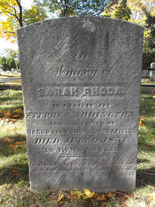 Sarah Rhoda Brookfield was born in 1773 at Springfield, Union (Essex), New Jersey.1 She married Stephen Addington before 1815.1 Sarah Rhoda Brookfield died on 9 July 1851 at West Milford, Passaic, New Jersey.1 She was buried on 12 July 1851 at Presbyterian Cemetery, Springfield, Union, New Jersey.1 Sarah Rhoda Brookfield Find-a-Grave.com ID # an unknown place ; 138582834.