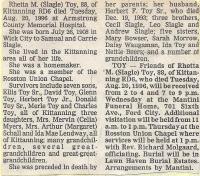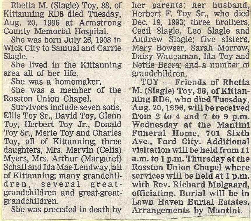 Rhetta Mildred Slagle married Herbert Flenner Toy.2 Rhetta Mildred Slagle was born on 2 July 1908 at Armstrong, Pennsylvania.1 She died on 20 August 1996 at age 88.2 She was buried on 23 August 1996 at Lawn Haven, Worthington, Armstrong, Pennsylvania.2 Rhetta Mildred Slagle Find-a-Grave.com ID # an unknown place ; 85211374.