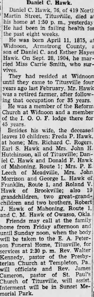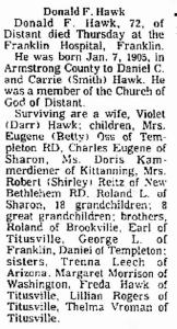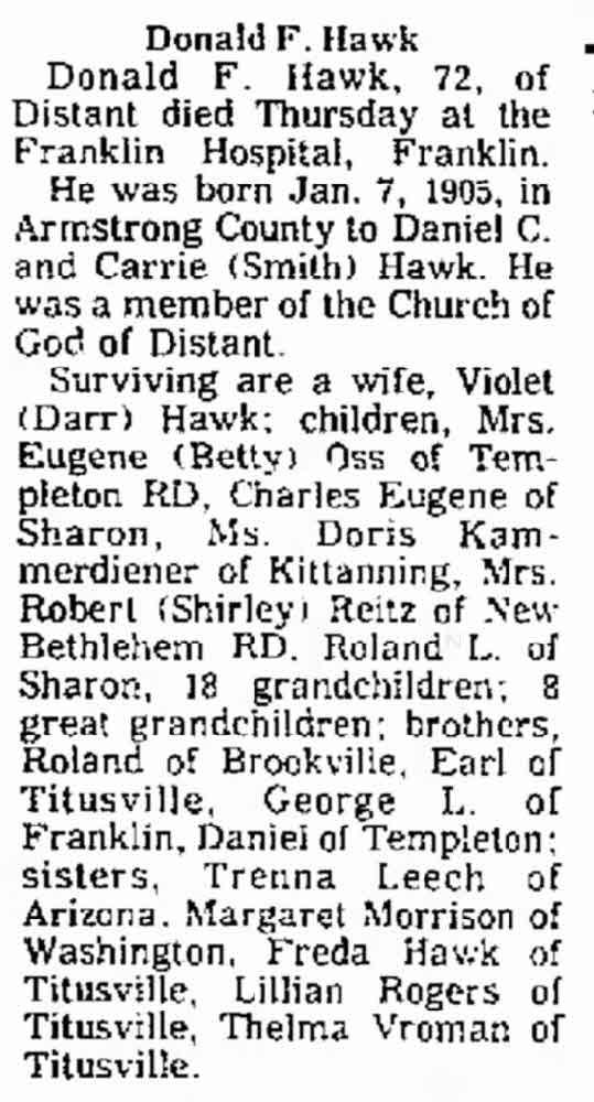 - [S30] Newspaper Obit, Published in Leader-Times, Kittanning, PA Apr 1 1977, page 8 for Donald Hawk.