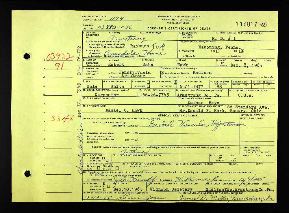 - [S32] Death Certificate, Pennsylvania Death Certificates 1906-1967 for Robert J Hawk # 116017-65.