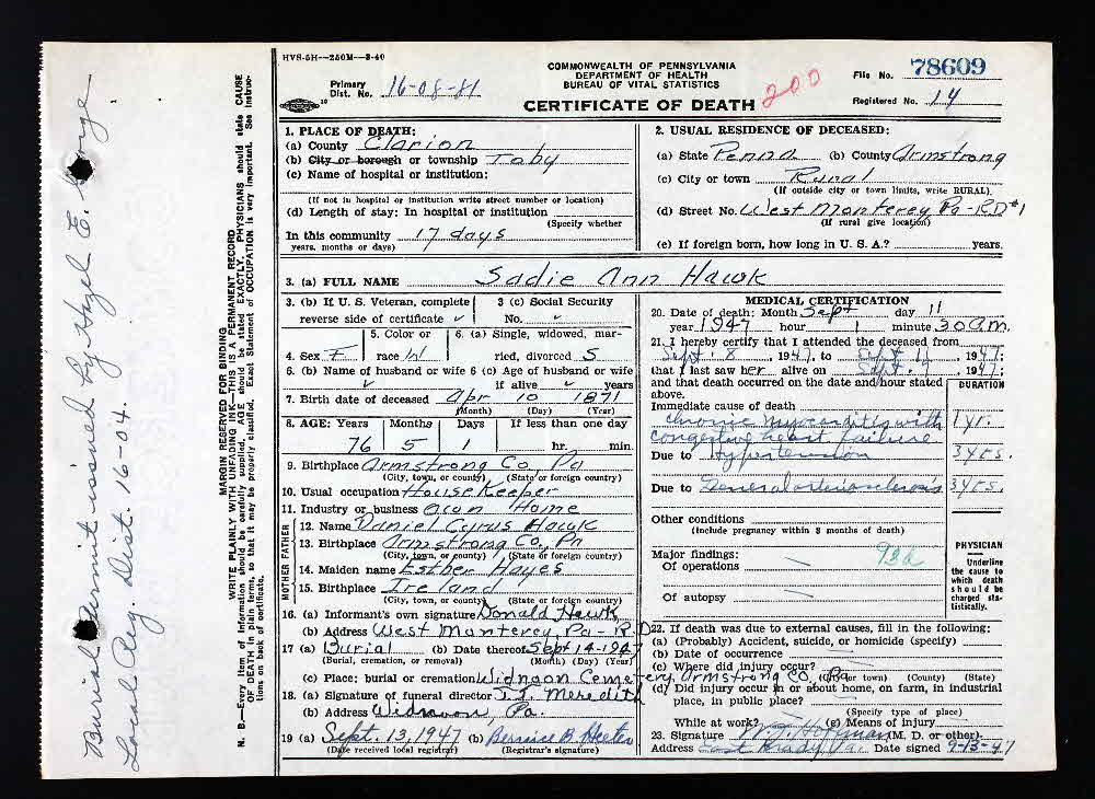 - [S32] Death Certificate, Pennsylvania, Death Certificates 1906-1967 for Sadie Hawk, # 78609.