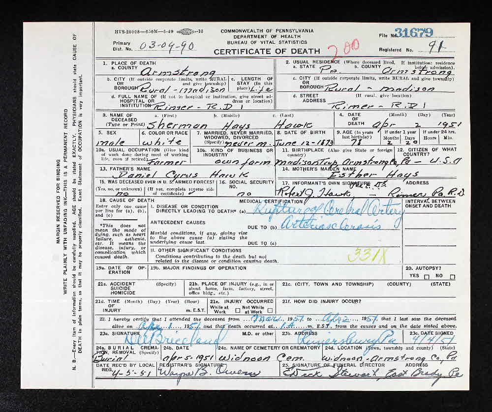 - [S32] Death Certificate, Pennsylvania Death Certificates 1906-1967 for Sherman Hawk # 31679.