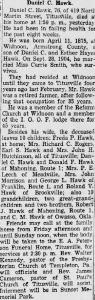 - [S32] Death Certificate, Pennsylvania Death Certificates 1906-1967 for Daniel C Hawk # 113193.